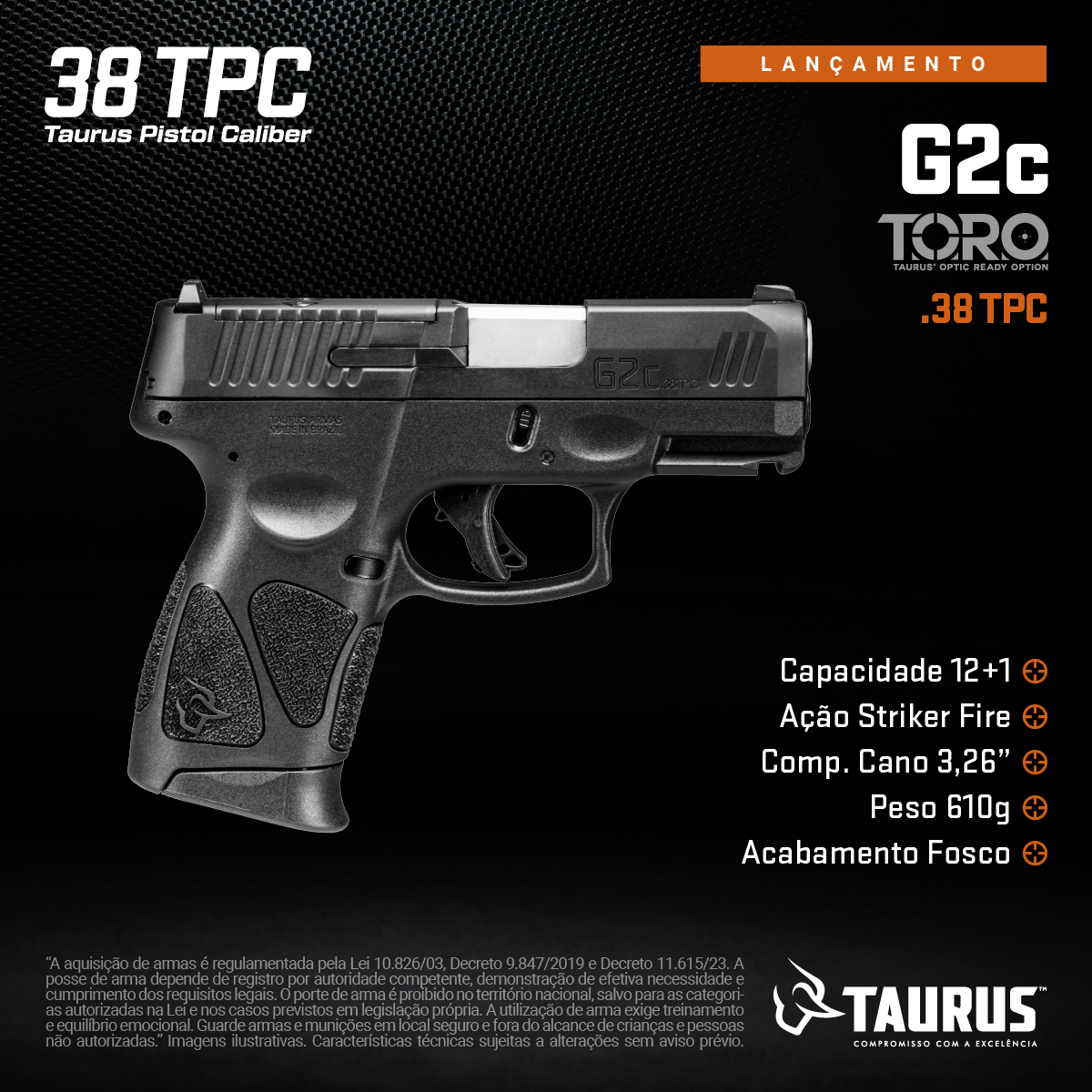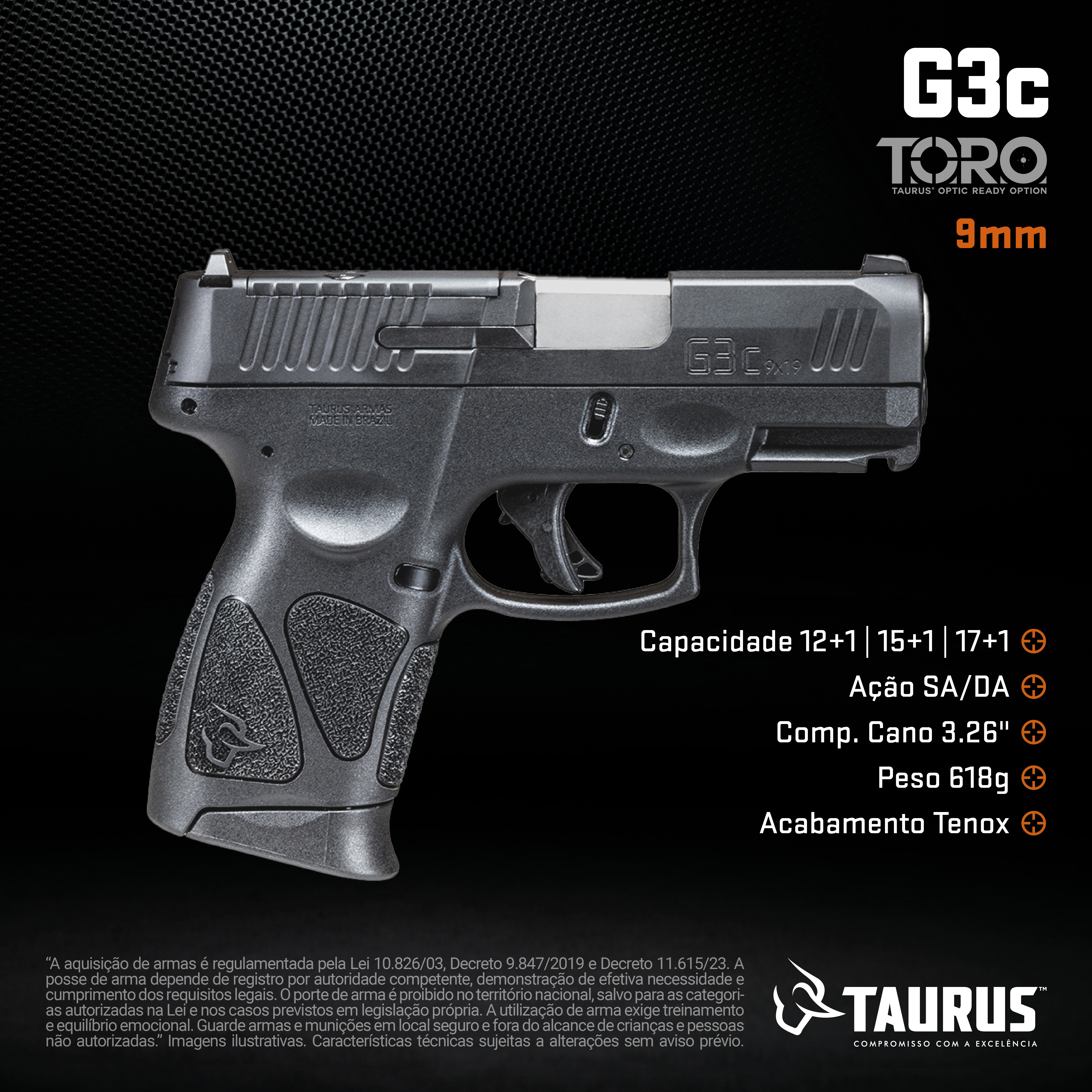 Pistola Taurus G3C TORO Calibre 9mm Tipo Funcionamento Arma: SEMI-AUTOMATICA Tipo Alma da Arma: RAIADA Calibre da Arma: 9x19mm Tipo Acabamento Arma: Tenifer matte black Quantidade Canos Arma: 1 Tamanho do Cano Arma: 81mm Número de Tiros Arma: 12 + 1 Espécie da Arma: PISTOLA Marca da Arma: TAURUS Tipo de Ação: SA/DA - DUPLA AÇÃO Tipo de Carregador: BIFILAR Tipo de Mira: MR - MIRA REGULÁVEL Sistema de Segurança: TRAVA MANUAL EXTERNA Quantidade de Carregadores: 2 R$: