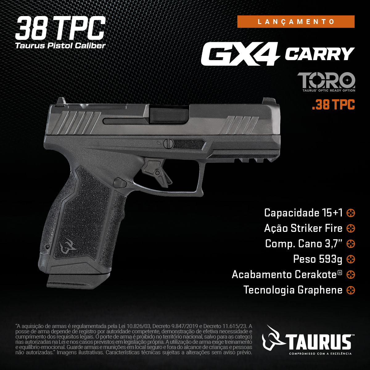 PISTOLA GX4 CARRY GRAPHENE .38 TPC Tipo Funcionamento Arma: SEMI-AUTOMATICA Quantidade Raias Arma: 6 Sentido Raia Arma: DIREITA Tipo Alma da Arma: RAIADA Calibre da Arma: 38TPC Tipo Acabamento Arma: CARBONO CERAKOTE GRAF Quantidade Canos Arma: 1 Comprimento de Cano: 94mm Número de Tiros Arma: 15 Espécie da Arma: PISTOLA Marca da Arma: TAURUS Quantidade de Carregadores: 2 PAÍS DE FABRICAÇÃO: BRASIL R$6.500,00