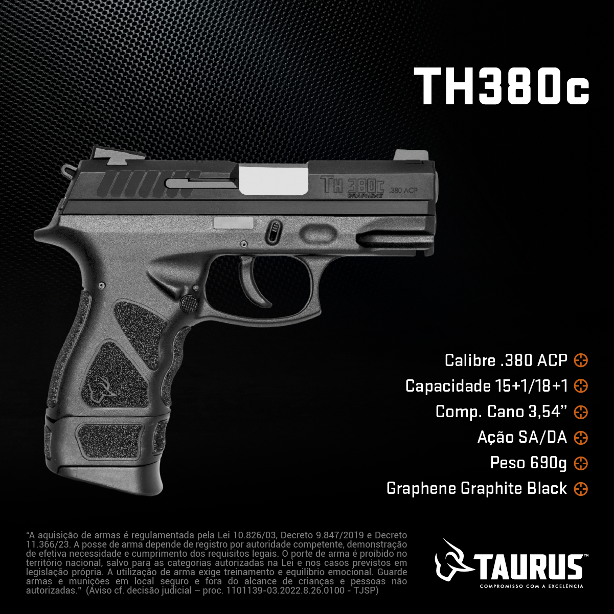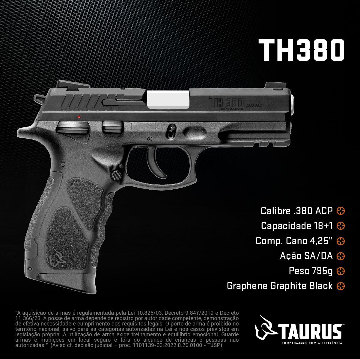 PISTOLA TH380 GRAPHENE BLACK CAL. .380ACP Tipo Funcionamento Arma: SEMI-AUTOMATICA Quantidade Raias Arma: 6 Sentido Raia Arma: DIREIT Tipo Alma da Arma: RAIADA Calibre da Arma: .380ACP Tipo Acabamento Arma: CARBONO CERAKOTE GRAF Quantidade Canos Arma: 1 Comprimento de Cano: 109mm Número de Tiros Arma: 18 Espécie da Arma: PISTOLA Marca da Arma: TAURUS Tipo de Ação SA/DA: DUPLA AÇÃO Tipo de Carregador: BIFILAR Tipo de Mira NT: MIRA NOVAK 3 PONTOS – TRI Sistema de Segurança: DESARMADOR DO CÃO Quantidade de Carregadores: 3 R$: