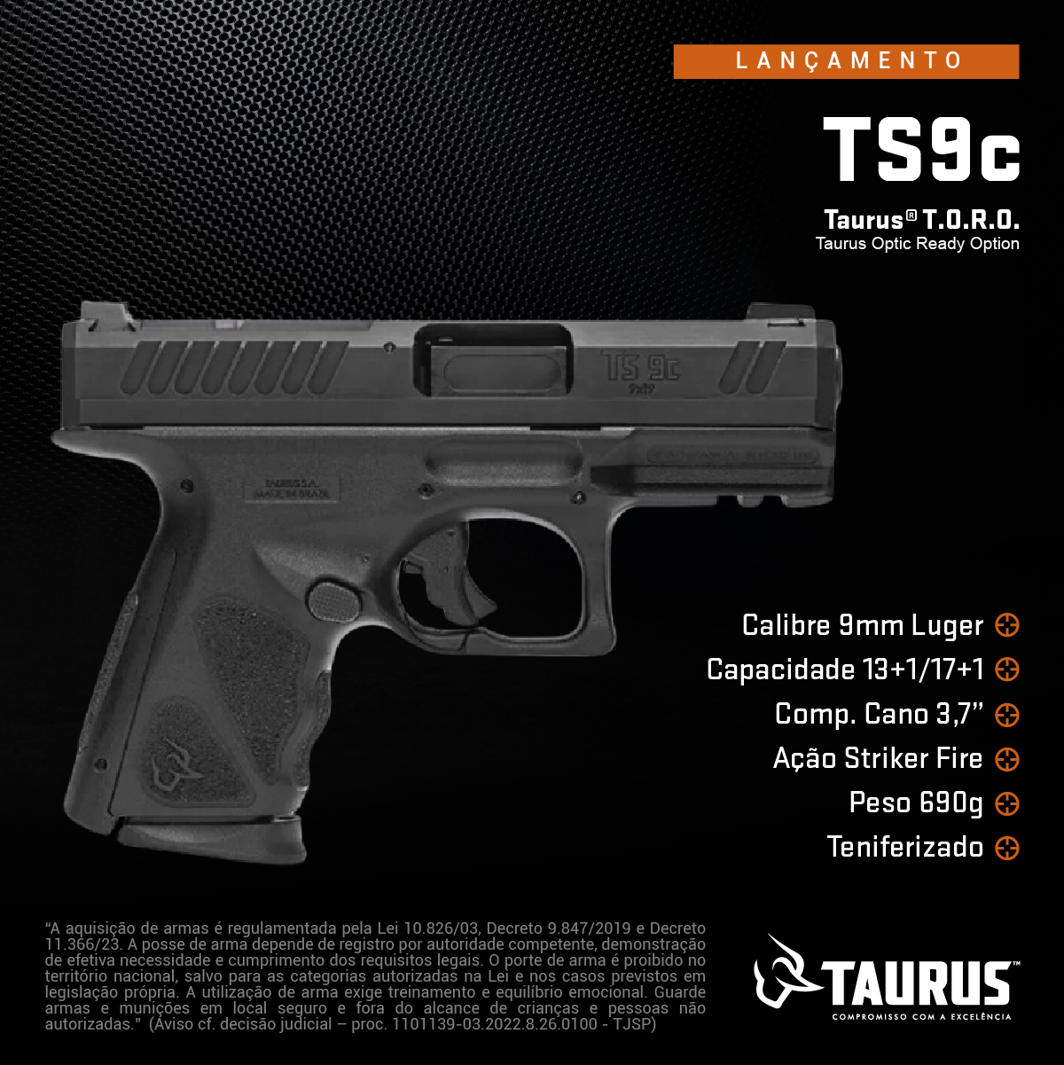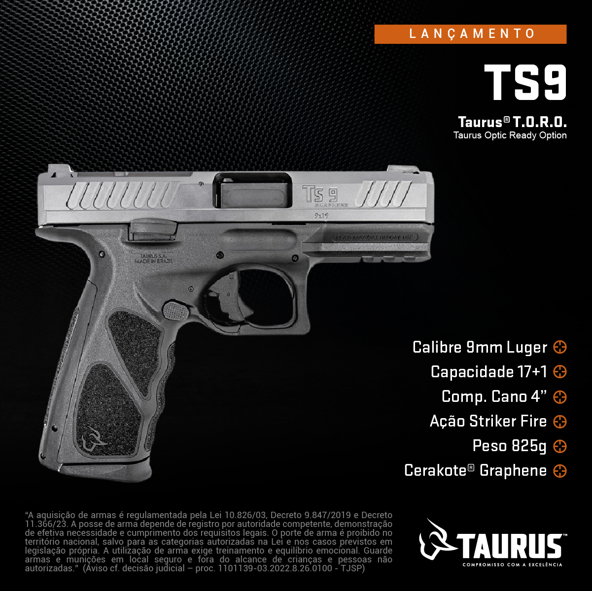 Pistola Taurus TS9 Grafeno Calibre 9mm Tipo Funcionamento Arma: SEMI-AUTOMATICA Quantidade Raias Arma: 6 Sentido Raia Arma: DIREITA Tipo Alma da Arma: RAIADA Calibre da Arma: 9mm Tipo Acabamento Arma: CARBONO FOSCO Quantidade Canos Arma: 1 Tamanho do Cano Arma: 102mm Número de Tiros Arma: 17+1 Espécie da Arma: PISTOLA Marca da Arma: TAURUS Tipo de Ação: Striker Fired Tipo de Carregador: BIFILAR Tipo de Mira: MT - MIRA TRITIUM Sistema de Segurança: TRAVA DO GATILHO Quantidade de Carregadores: 2 R$: